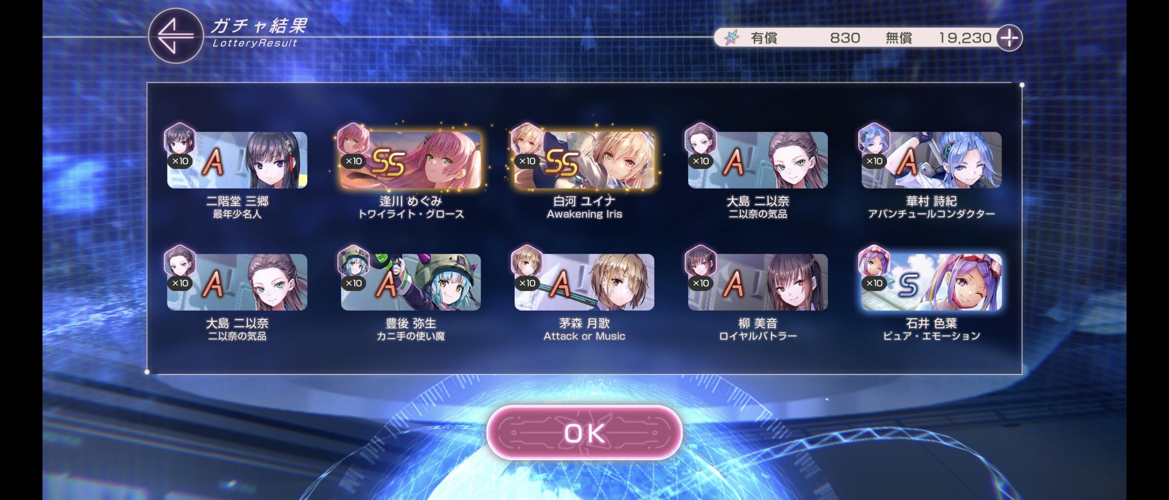 無料ガチャで雷シャロ、スーツルカ、スーツ東城、狐みゃーさん、水着すもも、大島二、大島四が出たわ